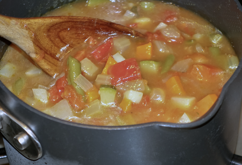 - Add the vegetables, broth and tomato mixture. Allow soup to cook for about 5 more minutes over medium heat.