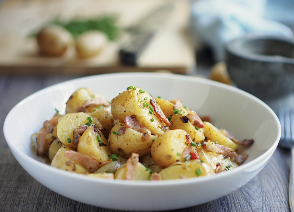 - Thinly slice the green onions. Add bacon, onions, vinegar, and the bacon grease to the potatoes and serve.