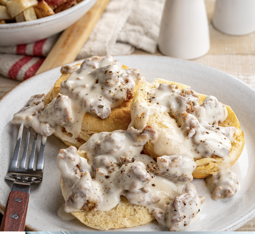 A healthier twist on this classic breakfast dish. Fluffy homemade biscuits smothered in a creamy, savory sausage gravy create a hearty and satisfying dish that's sure to become a family favorite.