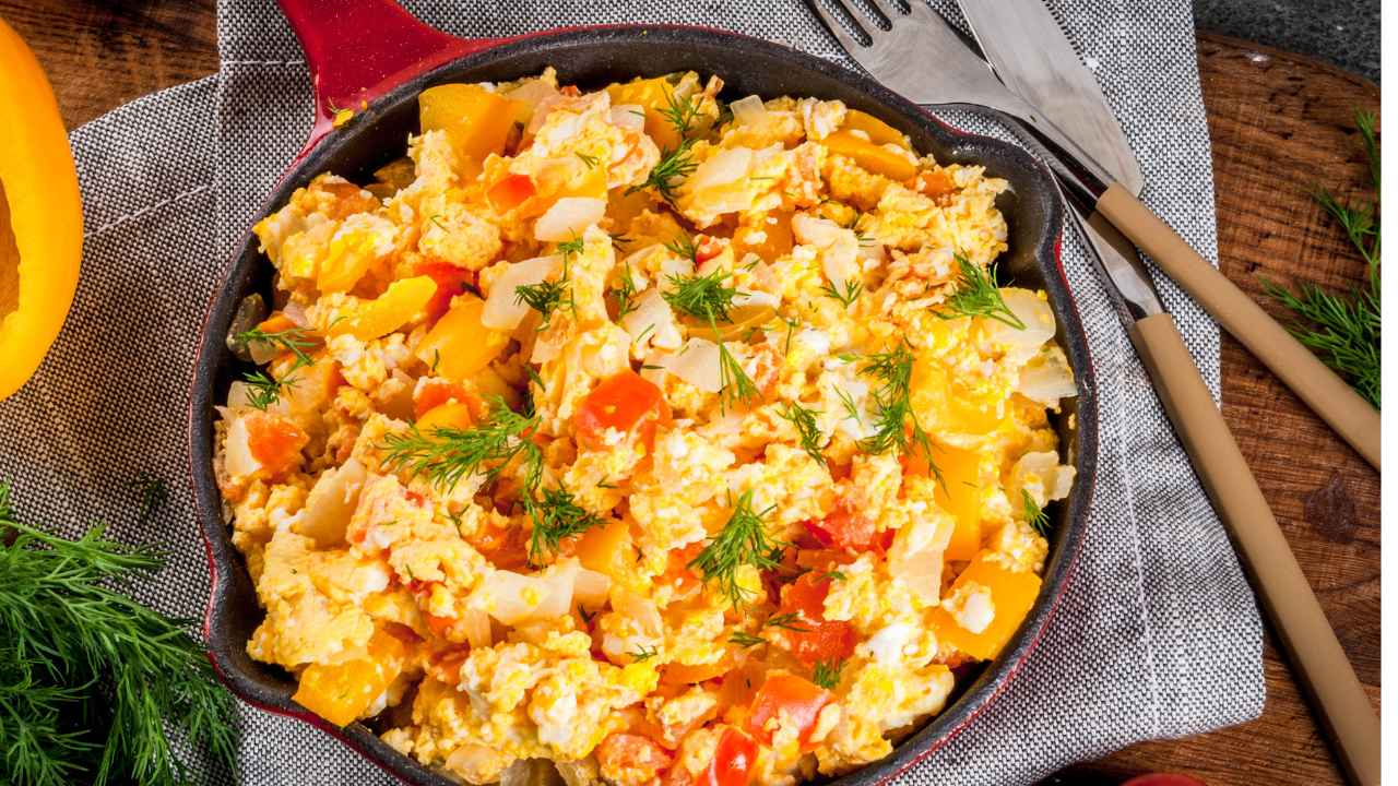 • Add asparagus, eggs, salmon, and dill. Stir while cooking until the eggs are set.