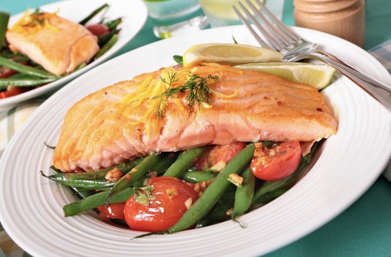 - Cut tomatoes in half and sprinkle with a little salt and pepper. Put them on the dish next to the salmon.